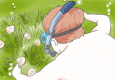 Look for scallops between the sand and the seagrass. Snorkel along the surface of the water looking carefully where the sea vegetation meet's the body of water's floor for the ribbed seashell of the scallop. Scallops typically have a dark, marbled top shell and a white bottom shell. #* While most scallops will be hard to spot by their dark top shells, it can be easier to pick out a few that have flipped over and have their white bottom shells showing. If it's a very sunny day, the scallops will be drawn to the top of the grass, making them easier to spot.