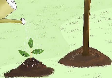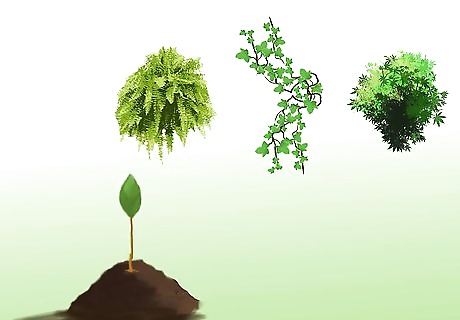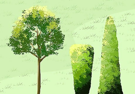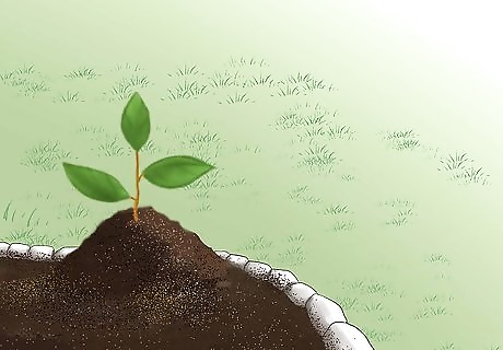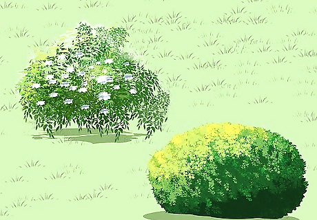 Finish with taller shrubs and trees. If you’re purchasing larger shrubs or small trees, look for specimens with unblemished bark and strong, evenly spread branches. Dig a hole for the root ball, and cover the bottom with compost or manure. For most trees, the top of the root ball should be level with the ground. Stake a newly planted tree for about year after planting by tying a short stake 1.5 feet (46 cm) in length at a 45 degree angle to its trunk. The nursery or home improvement store will carry stakes and tree ties.