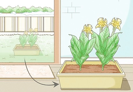 Bring your pot inside before the first frost. If you did bring your cannas outside for the summer months, make sure that you bring them back inside before the first frost has the chance to harm them. Store them indoors where the temperature stays at around 45 and 60 degrees F (7.2 to 15.5 degrees C). You can also dig up the rhizomes and store them in a plastic box with peat moss or perlite.