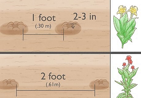 Dig holes that are 4 to 6 inches deep (10 to 15 cm). Plant your rhizomes (or tubers) in these holes, making sure that each dwarf or medium rhizome is at least 1 foot (.30 m) away from the next rhizome, unless you are planting them in a container, in which case you can often fit two or three tubers in a container. If you have a larger variety of canna rhizome, make sure that there is at least 2 feet (.61 m) distance between rhizomes. Make sure that the growing points (or eyes of the tuber) or pointing up.