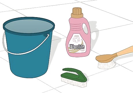 You will need a liquid cleaner specially made for woolen fabrics, such as Woolite, a small bucket, a scrub brush with nylon bristles and warm water. Mix the cleaner with warm water to produce a sudsy combination.