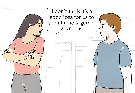 Consider ending the friendship. Sometimes the boy you want to back off is a friend. If he doesn’t respect your decision and keeps trying to initiate a relationship, then you may have to cut ties with him. While you don’t want to lose him, he’s not being a good friend to you. Additionally, he may believe that your continued friendship is a sign that you might actually like him. Distance yourself from him by saying “no” to spending one-on-one time with him. If you must cross paths with him, talk to your other friends about acting as a buffer. If he asks you to hang out, say, “I don’t think it’s a good idea for us to spend time together anymore.”