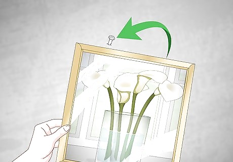 Hang your frame from a nail to hang your poster permanently. Position your nails on your wall about ⅔ of the way towards your ceiling. If you are hanging long posters, you may want to raise your nails to the top of your wall. Then, hammer your nail into place. For a more secure hold, hammer in another nail about 1–3 in (2.5–7.6 cm) away from your first nail.