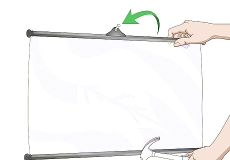 Hammer a nail into your wall and hang up your poster. Using a hammer, secure a nail into place for a permanent hanging method. Hold the nail to the wall at a slight angle, and pound the nail 2-5 times until it is secure in the wall. Your hangers will either come with an attached string, or you can hang the poster by the clip on the top hanger. If your silk poster is very long, hammer your nail towards the top of your wall. For smaller silk posters, place them about ⅔ of the way up your wall, so they hang a bit above eye level.