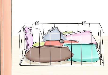 Hang wire baskets on the side of your closet to organize clutches. If you have a lot of small clutches, use small baskets to keep them tidy and easy to see. You can repurpose wire baskets that you find at a thrift store or yard sale, or purchase them new from a home goods store or online. If you have the room, the side wall of your closet is the perfect spot for this space-saver, but the back of your closet door may also work. If your wire baskets are heavy, use a stud finder to secure them to a beam, or use drywall anchors if you can't find a stud.