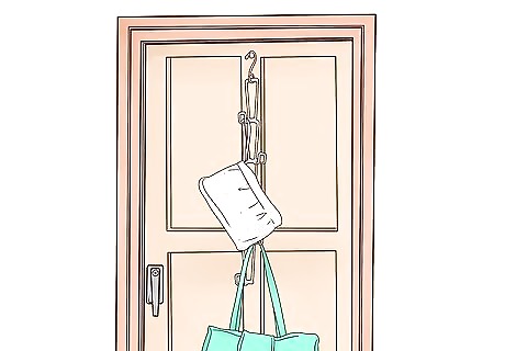 Hang over-the-door hooks if you need to save space. If you have a smaller closet and just a few purses to hang, an over-the-door coat rack could be the perfect solution. Just slip it over the top of your door and hang your purses from the hooks! If you have sliding closet doors, try using stick-on hooks instead.