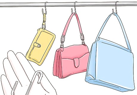 Use S-shaped shower hooks for an easy way to hang your purses. Slip the wide hook over the bar in your closet, then hang the purse from the smaller end. Hang your favorite purses where they're easy to reach, then store extra bags further toward the back of the closet. If you have wire racks in your closet, you can hang the smaller end of the hook on the rods, then hang the purses on the wider curve.