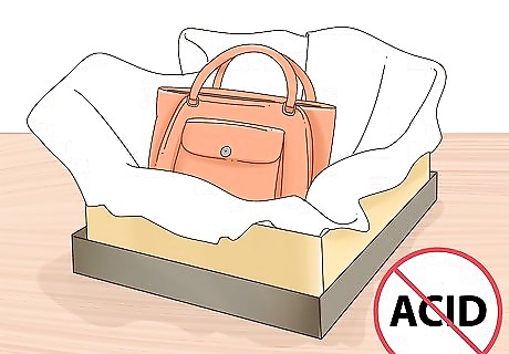 Stuff each purse with acid-free tissue so it will keep its shape. Whether you invest in luxury bags or you just want to keep your purses looking new longer, stuffing a purse before you hang it will help keep it from caving in and losing its shape. Acid-free tissue will keep the purse from discoloring while protecting during storage. You can also use bubble wrap or a small pillow, if you prefer. You can buy acid-free tissue paper anywhere you buy craft supplies.