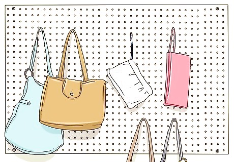 Hang a pegboard if you have a lot of purses and plenty of space. If your walk-in closet has turned into a jumbled pile of purse straps, a pegboard can help you get organized. Clear off a wall (or a section of a wall), then screw the pegboard securely onto your wall. Place pegs in the holes, then hang the purses from the pegs. Using a pegboard will allow you to see more of your purse collection, and it's easy to rearrange if you like to switch up your purses often.