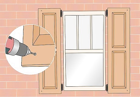 Attach the hinges to shutters that open and close. Set the hinges against the left side edge of your first shutter. Use a regular drill and drill bit to drill the pilot holes through the screw holes. Insert the screws, then screw them into place. Repeat this step for the right side edge of your second shutter. You can mark the pilot holes with a pencil first, set aside the hinges, then drill the holes. You will need 2 hinges per shutter: 1 towards the top edge and 1 towards the bottom edge. Skip this step if you are using stationary (decorative) shutters.