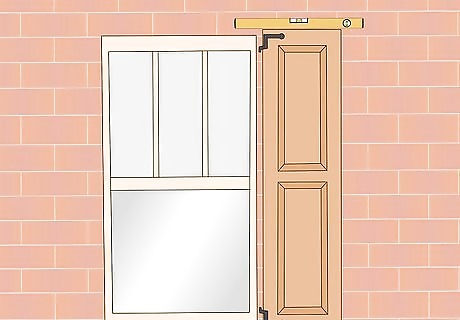 Place the first shutter against the wall. If you are attaching stationary shutters, start with just 1 shutter for now. Use a level to ensure that it is hanging straight; the air bubble should be between the 2 lines in the middle of the glass tube. If you are attaching your shutters with hinges, set both of them into the window frame in the closed position. Use wooden shims to keep them in place.