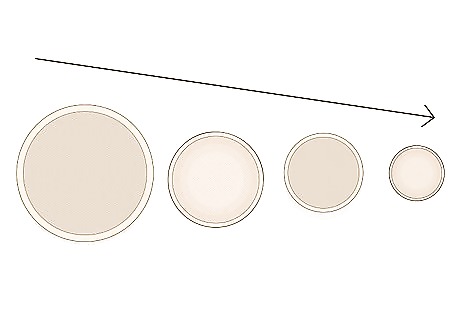 Place your baskets on the wall based on size. Arrange your baskets on a flat surface, then sort them by their overall size and diameter. To create an engaging design, try placing your larger baskets on 1 side of the wall, then hang up baskets that gradually decrease in size. As a simple design idea, place your woven baskets in a straight line on your wall, arranging them in descending order by size. Alternatively, arrange the baskets in a circle. Put the largest basket in the middle and group the others around it so they get smaller toward the edges.