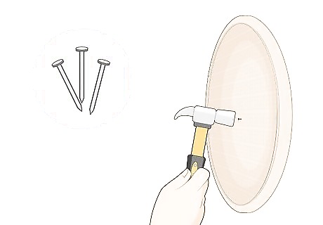 Hammer a finishing nail into the center of the basket. Hold the rim of the basket in place with 1 hand, then use your opposite hand to place a finishing nail into the center or upper portion of the basket. Use 1 hand to secure the nail in place, then gently tap the nail with a hammer to force it into the wall. Once the nail is in place, you can remove both your hands from the basket. Finishing nails are only 1 in (2.5 cm) or so long, and don’t take up as much space as traditional nails. You can find them online, or at your local hardware or home improvement store.