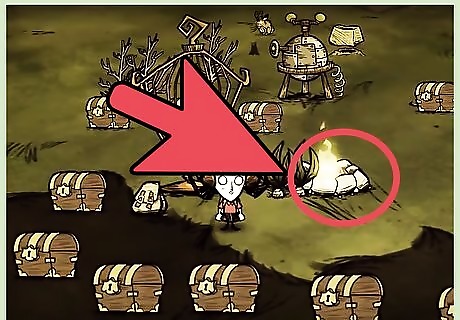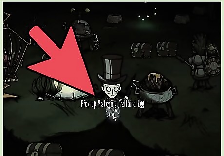 Start the hatching process. Tallbird Eggs start hatching when warmed to a point, and what better way is there than to build a nice, warm fire? Simply drop it near a fire or any kind for about 10 seconds and you’ll see the egg starting to crack immediately. After the initial warming, the Tallbird Egg would become a Hatching Tallbird Egg, which means you’re one step closer to getting yourself a tiny, adorable minion. A Fire Pit would be best used during winter since it’s a permanent, refuelable source of light and heat. Campfires are better during the other seasons, since they extinguish more quickly, which means you can just work or explore the night away and come back to a still-hatching egg.