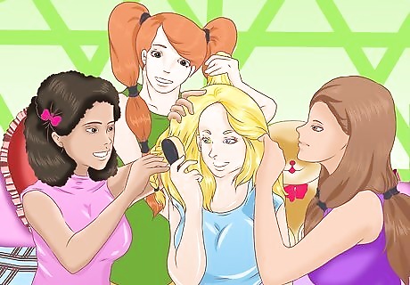 Pamper each other. Bring in nail varnish, hair ties, bobby pins and make up and give each other makeovers! This is a fun, girly thing to do, and gives everyone something to do. You could even to a "Hairstyle Line", where you all sit behind each other and give the person in front of you a beautiful or crazy hairstyle.