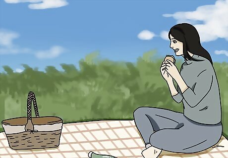 Have a picnic outside if you want to enjoy a meal. Prepare a meal that you can transport easily, such as sandwiches, chips, fruits, and vegetables. Pack the meal in a lunchbox or a picnic basket, and take it with you wherever you want to have your picnic. Spread out a blanket or sit at a table so you can enjoy your meal outdoors. Be sure to pick up any scraps or waste so you don’t litter. You can have a picnic in your yard or you can travel to a nearby park. Ask your parents for help if you aren’t able to prepare your own meal. Bugs or animals may be attracted to your food, so don’t leave anything unattended for longer than a few minutes.