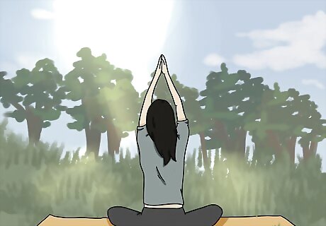 Practice yoga outdoors so you can be closer to nature. Find a place that’s shady and has level ground to put your yoga mat so you’re less likely to fall during your poses. Go through your regular yoga routine or follow along with one on a phone or laptop. Try to focus on the sounds of nature around you to feel calm and relaxed while you work through your routine. Use an old yoga mat if possible so the one you use indoors doesn’t get too dirty. If there are loud noises in your area, try wearing headphones while doing your poses.