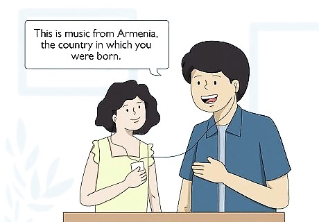 Share the music of your child's adapted culture with them. There are several ways to introduce your adopted child to music of their native culture. You could provide your child with lessons for a musical instrument native to their birth country. For instance, if your child's birth parents were from Armenia, your child might find that learning to play the duduk helps them connect to their native culture. Visit your local music shop to find out if they offer lessons in the duduk (or whatever the native instrument of your adopted child's culture of origin are). You might also choose to provide your child with recorded music. Visit your local library and ask for recordings of music from your child's native culture, or check out relevant recordings online. Offer an explanation and discussion (appropriate to the child's age) to have them understand that the music or instrument is from their native culture. For instance, if you want to share the music of Armenia with your adopted child, explain, “This is music from Armenia, the country in which you were born.”
