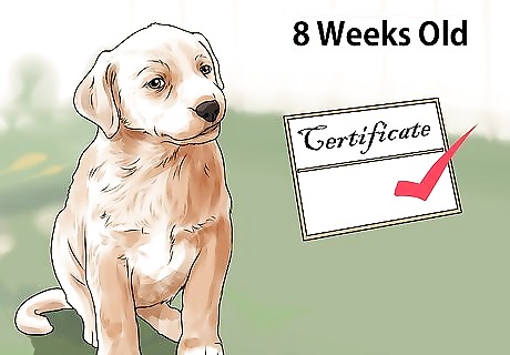 Verify the puppy’s age. Many puppy mills will sell a puppy as young as six weeks. A reputable breeder will never remove the puppy from its litter before eight weeks of age, and some will wait until up to twelve weeks. To make sure your puppy is old enough to leave the litter, you should try to check its age. Ask for documentation that the dog has received their eight week vaccinations. This should be signed by a veterinarian, who you can call to authenticate the records. This will prove both that the puppy is healthy and that they are the right age. Eight week old puppies will be running around, and their eyes will be fully open. They should be fully weaned off their mother’s milk and capable of eating solid foods. They will sleep about 18 to 20 hours a day, but when they are awake, they will be active.