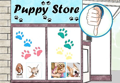 Boycott puppy stores. Almost every pet and puppy store that sells puppies receives their dogs from a puppy mill. Buying these dogs, even to rescue them from the store, will encourage mills to keep breeding dogs in abusive conditions. Some pet stores may advertise their puppies as coming from USDA breeders, but this does not mean that the puppies came from humane conditions. Stores that sell puppies from USDA breeders are actually more likely to buy from puppy mills. Some pet stores will hold adoption events by bringing in dogs from local shelters. Verify with your local shelter that these dogs do indeed come from them before adopting at one of these events. Puppies sold online also often come from puppy mills.