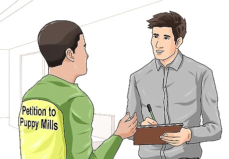 Circulate a petition. Petitions are a good way of encouraging your local representatives to take action. Write up a petition for stricter regulations for breeders. You can stand out in front of grocery stores, universities, and shopping centers to encourage people to sign, or you can start an online petition that you share through email and social media. Websites like Change.Org or The Petition Site are good places to start petitions. If there is an existing petition with many signatures, you might sign that instead of making your own. Share it with your friends so that they can help it gain momentum.