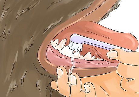 Care for your dog's teeth and gums. Brushing your dog's teeth is very important. Many dog breeds suffer from oral health issues just like humans. Taking a few minutes a day or at least once a week to remove plaque is an important way to avoid these health risks. Simply apply pet toothpaste to a dog toothbrush. Then, lift your dog's lip to reveal the teeth. Carefully brush the outside and inside of each tooth. Purchase toothpaste that is made for pets. Rather than mint, these pastes are typically flavored like foods your pet enjoys. Do not use human toothpaste, as it may be harmful to your dog. Allow your pet to get used to the toothbrush and toothpaste. Let them smell or taste the paste. Start by simply brushing one or two teeth, and seeing how your pup reacts. Start brushing when your dog is young, so they're used to the activity when they reach adult maturity.