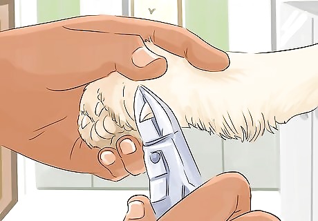 Keep nails trimmed. When they’re too long, nails may get stuck, chip, or break. This can be extremely painful for your pup. There’s also a large vein in pet nails called the quick, and when this vein is accessed, the result could be heavy bleeding, which can be very dangerous for your dog. To trim the nails, use baby nail clippers or clippers that are made for animals. If your pup has white nails, you’ll be able to see the quick. It is the dark pink part of the nail. If your dog has darker nails, you will need to remove a small sliver of nail at a time. After each snip, look at the newly revealed part of the nail checking for a gray-colored area. This is the quick. Stop clipping when you can see the quick. Apply styptic powder to stop the bleeding if you nick the quick.