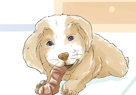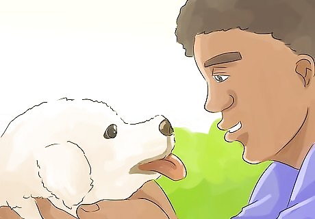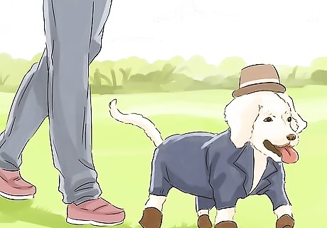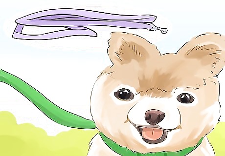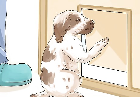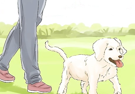 Train your dog. Start early, and focus training on making sure your pup is safe and free from stress. For instance, train your dog to walk on a leash. This will prevent them from running away, which could lead to injury caused by cars or other dogs. You should also house train your pet. It’s important to your health and your dog’s that waste be excreted outside, so train your dog to use a dog door, ring bells to alert you they need to go outside, or use any other house training system that works for your unique needs.