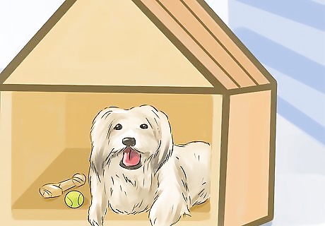 Provide your pup with their own space. Dogs feel safest when they are enclosed, so giving them a dog house or crate that is comfortable and includes toys and treats that they like makes them feel secure. You can also give your dog their own bed. While it’s not enclosed, having a place of their own where they feel comfortable is a great way to keep your dog happy. Crates or dog houses should not be used just for transportation or as a punishment. Make sure crates and beds provide adequate padding to protect your dog from putting too much pressure or strain on joints.