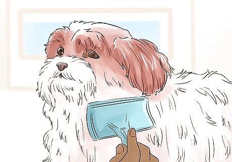 Brush your dog. You should do this for dogs of any coat length at least once each week. While this may not seem like a significant way to improve your dog’s health and longevity, foreign debris caught in the fur can lead to a number of health concerns. For instance, an irritating substance in the fur like a bur can rub against the skin, causing rashes or sores that may lead to more serious issues, infections, or skin conditions. Use a slicker brush that has numerous, close together bristles to detangle long dog hair. These bristles are able to slip between hairs, detangling without pulling. Use detangling solution or mineral oil to soften stubborn tangles.