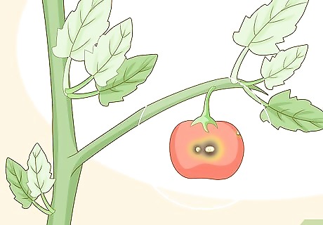 Look for brown blotches on the fruit to confirm blight. Blight also affects the tomatoes themselves. It usually causes large brown blotches on the tomatoes. Most fruits will fall off before reaching maturity. Dark spots that appear to be forming under the skin may indicate internal rotting or mold growth. Confirm that spots on the fruit are blight by looking for similar lesions on the leaves. Blight is sometimes confused with blossom-end rot. This is when tomatoes rot from the bottom up. It isn't caused by a fungus, but rather by too much moisture and a calcium deficiency.