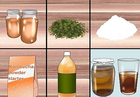 Grow your own kombucha. To make 1 quart of kombucha from green, black or white tea, steep 1 ½ teaspoons of loose tea (or 2 tea bags) in 2 to 3 cups of hot water. Add ¼ cup of sugar and mix it thoroughly. Once cooled, add ½ cup of vinegar. Add the “scoby” (a kombucha tea starter) which should be about 2 inches in diameter and about ¼ inch thick. Cover the jar with cheesecloth and put a rubber band around it. Let it ferment for up to 30 days at 68 to 85 degrees out of direct sunlight. You'll see the scoby growing on top and it should become 1/4 inch thick before the kombucha is ready.