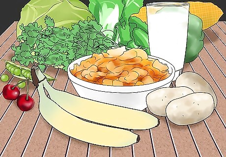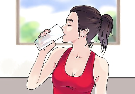 Drink water. The Institute of Medicine recommends that you drink 8 eight-ounce glasses of water a day. To help you get in the habit, try drinking a glass of water before each meal. Drinking water helps your body remove waste and softens your stools, making them easier to pass. While you can drink juices to improve hydration, avoid drinking a lot of caffeine, carbonated beverages, or sodas. All of these can irritate your stomach.