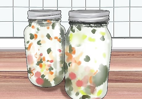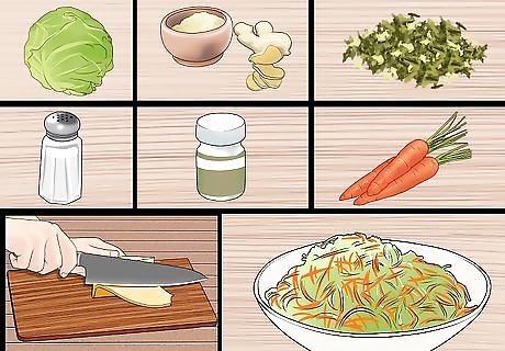 Prepare sauerkraut. Mix the following ingredients and firmly pack the mixture into a quart-sized canning jar. Leave about 2 inches free at the top of the jar. Cover the top of the jar with cheesecloth and clamp it on with a rubber band. Let the sauerkraut sit and ferment for 4 to 12 days at 67 to 72 degrees F. For sauerkraut, mix: 1 small head of green or red cabbage, chopped 1 medium carrot, chopped 1 teaspoon ginger, 1 teaspoon dill weed, and ½ teaspoon sea salt ¼ teaspoon probiotics (1 capsule) or probiotic culture starter ½ of a lemon, juiced ¾ cup of filtered water