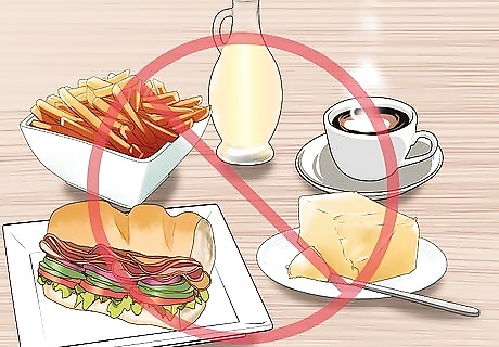 Avoid foods that irritate your stomach. You might notice that your digestive system doesn't handle certain foods very well. Maybe you have constipation, diarrhea, nausea, or get gassy after eating them. Consider tracking what foods bother you, so you can avoid eating them. Common food irritants include: Fatty foods: cheeses, deep-fried foods, processed or fast food Highly acidic foods: coffee, tea, tomatoes, vinegar, citrus fruits Gassy foods: beans, cabbage, or carbonated drinks Spicy foods: chili, peppers