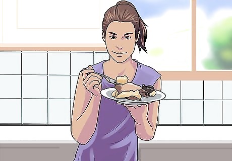 Slow down when you eat. Eating slowly will help you feel fuller faster, so you don't eat as much at meals. When you chew, your saliva begins breaking down the food in a process called mechanical digestion. Taking your time to slowly eat meals and chew your food can help overall digestion, since your stomach won't need to work as hard to break down the meal. Try to take at least 20 minutes to eat a meal, since this is how long it takes signals to reach your brain telling it that you're full. You can also help your stomach digest food by eating smaller, more frequent meals. For example, eat 5 or 6 small meals throughout the day instead of 3 large meals.