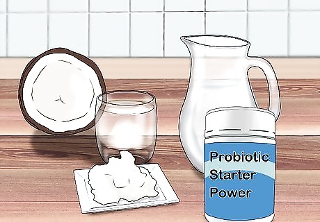 Make a non-dairy coconut kefir. Mix 2 cups of coconut water, 1 cup of coconut meat, and 12 cups of water. Pour this into a glass container and add 1 tablespoon of kefir grains or 1 teaspoon of probiotic starter power (or 4 capsules of probiotics). Cover the container with cheesecloth and let it sit and ferment at 70 to 75 degrees for 12 hours. Stir and strain the kefir grains. Use the kefir after 24 to 48 hours. You can re-use kefir grains after making your own kefir. Pat them dry with a clean towel and store them in the freezer.