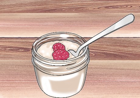 Start your day with fermented foods. For breakfast, consider making a fruit and yogurt smoothie. Or, make a fruit or coffee lassi by blending fruit or espresso with kefir. If you prefer something savory for breakfast, make an omelet and fill it with kimchi. If you're looking for something quick, make your own yogurt cups by topping plain yogurt with fresh fruit or jam. This way, you get the health benefits while avoiding the high sugar found in many commercial yogurt cups.