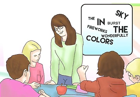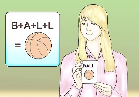 Start putting letters together into simple words. Once your student has learned letters fluently, it's time to start building words out of those letters. Start out slowly, working on short, simple words at first. As your student gets more comfortable you can progress to longer, more complex words. Say a word out loud. Show your student a flashcard with that word written on it. Use the word in a sentence. Have your student say the word out loud while looking at the flashcard.