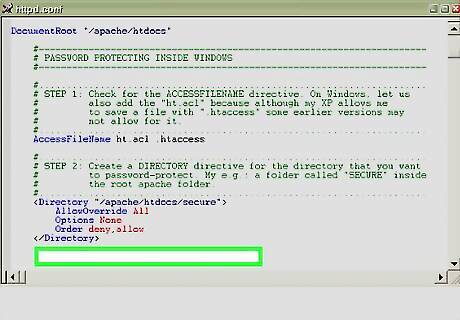Highlight and copy the text from this page, and then paste it into the httpd.conf page to ensure there are no typos. Hit "Enter" after the last line to ensure there is one blank line at the end of the file.