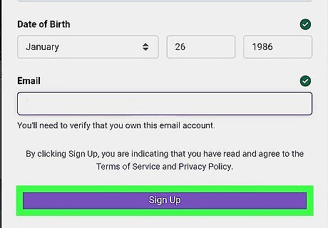 Tap Sign Up. This is a button that turns purple once you’ve finished entering your account information and will direct you to a page for entering your verification code.