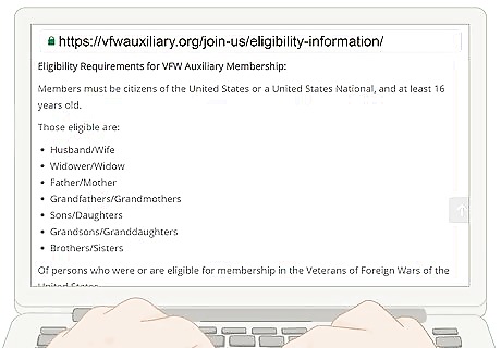 Check that you meet the legal qualifications for joining. Search for documents that prove that one of your close loved ones, like a parent, spouse, grandparent, child, or sibling is a veteran of a foreign war. Look for documents that indicate that your family member received a campaign medal, or that they received Imminent Danger or Hostile Fire Pay. Additionally, see if your veteran family member ever served in Korea for 30 straight days or 60 non-consecutive days. Your veteran family member must be an American citizen with the documentation to prove it. If your family member doesn’t qualify for VFW, then you won’t qualify for VFW Auxiliary. Step-children or step-parents and half-siblings qualify for this type of membership. Unfortunately, military connections with nieces or nephews, cousins, in-laws, uncles or aunts, and great-relatives don’t qualify you for VFW Auxiliary membership.