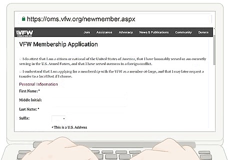 Fill out an application online or mail one in. Print out or fill out a digital form with your relevant personal information. You’ll need to specify your name, address, state, country, zip code, email, birthday, phone number, SSN, and gender. After submitting the form, check your email for confirmation. You can find the application on this site: https://oms.vfw.org/newmember.aspx. If you’re planning on mailing in your form, use the document on this site: http://www.vfwpost369.com/MailMemberApp.pdf. Mail any printed applications to: Membership Department, VFW National Headquarters, 406 West 34th Street, Kansas City, MO, 64111.