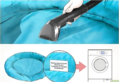 Wash your dog’s bedding once a week. Use a handheld vacuum or tube attachment to clean off any excess dog hair that’s sticking to your pet’s bedding. Next, check the care label on the bedding to find out if it’s machine washable. If you notice any obvious stains, rub a special stain detergent into the spot. While following the care label’s instructions, machine or hand wash the bedding with regular detergent, then let it air-dry for several hours. Some dog bedding can be machine washed and tumble dried at a low heat setting. You might only need to wash the bed cover, depending on the type of dog bed that you have.