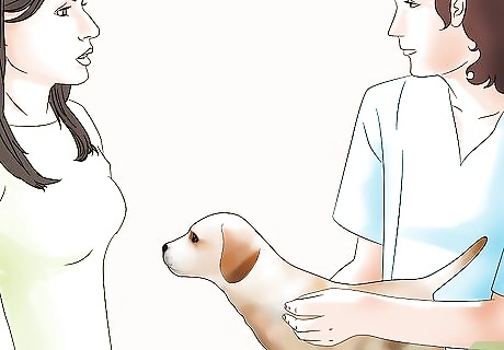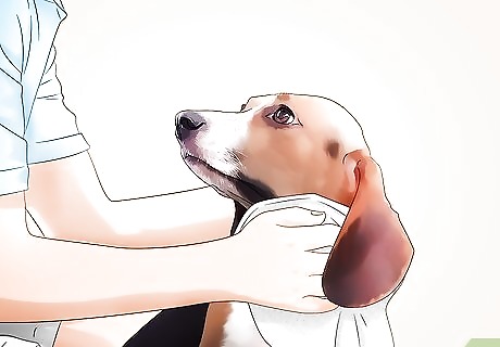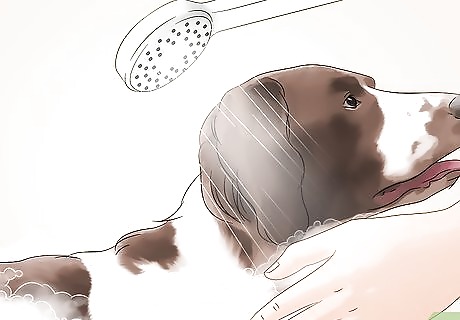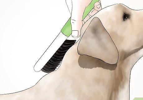 Bathe your dog once every 2-4 months. When your dog is clean, your house will be cleaner, too! To bathe your dog, arrange a sturdy, non-slip mat or towel along the bottom of the bathing area. With a gentle, pet-friendly shampoo, use your hands to lather the soap into your dog’s fur. To finish up, use a slow, warm stream of water to rinse all of suds from your pet’s coat. Try not to get any shampoo or water around your dog’s eyes, ears, and mouth.