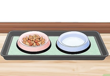 Place a mat under your dog’s food and water bowls to prevent a mess. Search your local home supply store for a thick, sturdy bathroom mat. Before getting your pet’s food and water ready for the upcoming day, arrange this mat beneath both of the bowls. If your pet ever makes a mess, you can easily wipe up the mat to get rid of any spills! If you have a smaller dog, consider arranging the bowls and mat on a sturdy plastic tray.