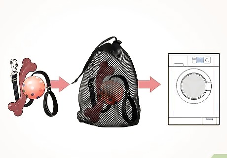 Clean dog toys and leashes in the washing machine. Keep an eye on your dog’s well-loved plastic toys, as well as their most-used leashes and collars. While these items don’t need to be washed on a weekly basis, use your washer to keep your pet supplies from collecting dirt and other germs. When cleaning plastic dog toys, leashes, and collars, place the items in a mesh bag, then wash them with your usual detergent. Note that plastic dog toys need to be cleaned in a delicate cycle, while leashes and collars can be washed in a regular cycle with other clothes. Before using any of them items again, wait several hours so they can air-dry completely. Only wash nylon or cloth collars and leashes.