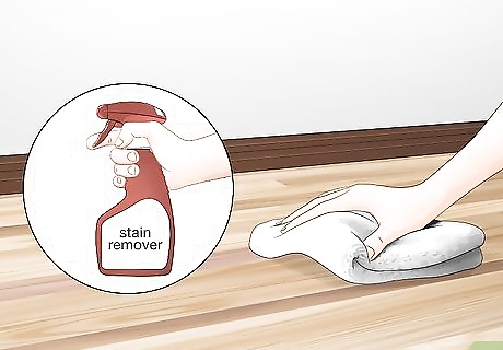 Spot treat any messes on your floor with stain remover. Try to blot and clean up any visible bathroom accidents as soon as they occur. To prevent your dog from defecating in the same place, use a specialized stain remover that removes any foul scents from your carpet. Even if your dog is housetrained, you might want to keep this item on hand. You can find pet stain removers at most pet stores, or any place that sells dog supplies.