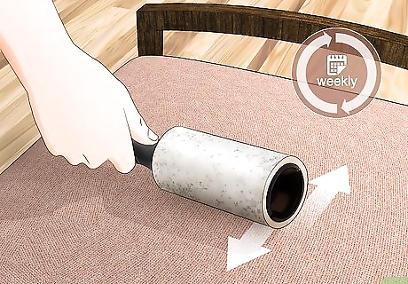 Wipe off your furniture with a lint roller on a weekly basis. Take a lint roller and run it over the backing, seating, and arm rests of your furniture. Focus on the areas where people sit the most, so extra hair doesn’t stick to anyone’s clothing later on. Try to do this once a week, or whenever you notice obvious strands of dog hair on your furniture. If your dog isn’t allowed on the furniture, you might not need to use a lint roller as often. Try placing washable slipcovers on your furniture for easy cleaning!