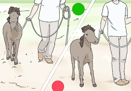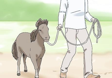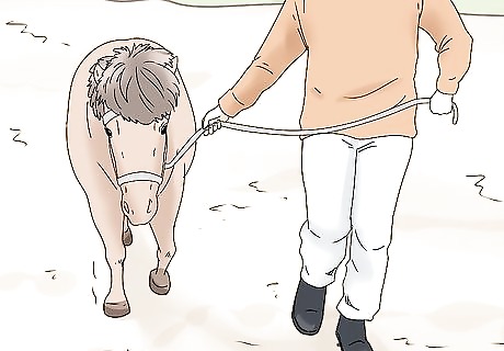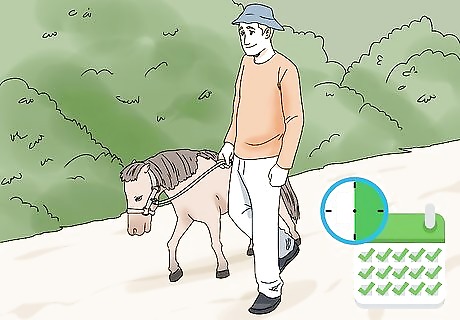 Trot your horse once walking laps becomes easy. Start jogging and give your horse 2 clicks with your tongue as a command to trot. When it’s first learning, encourage your miniature horse to pick up speed by patting its hindquarters. Use verbal praise to encourage your horse to keep trotting. Alternate between trotting and walking for the horse’s 30-minute workout. If necessary, you can lightly tug on the horse’s line. Wait until your horse is able to complete its walking workout without exerting much effort before you add trotting.